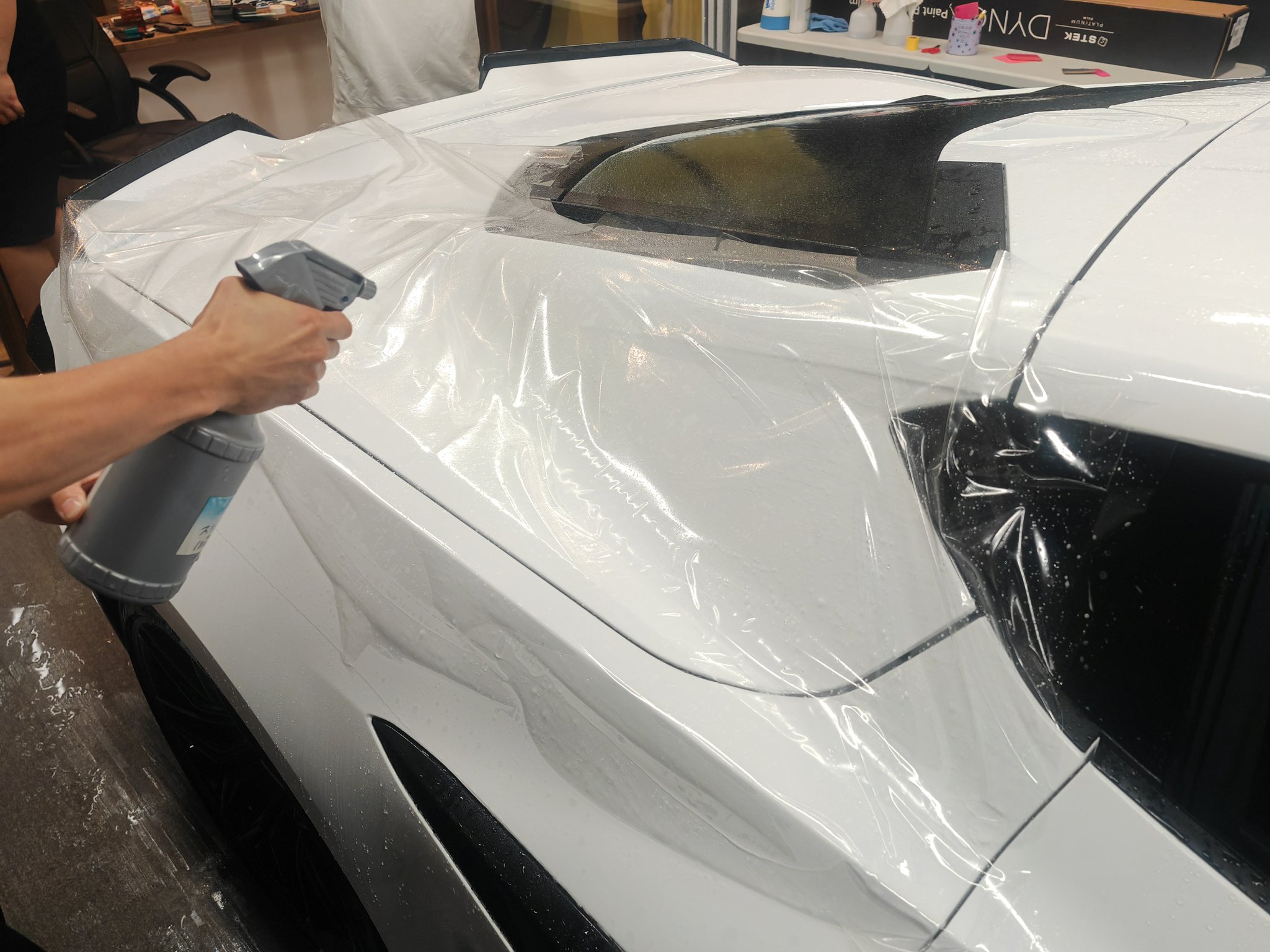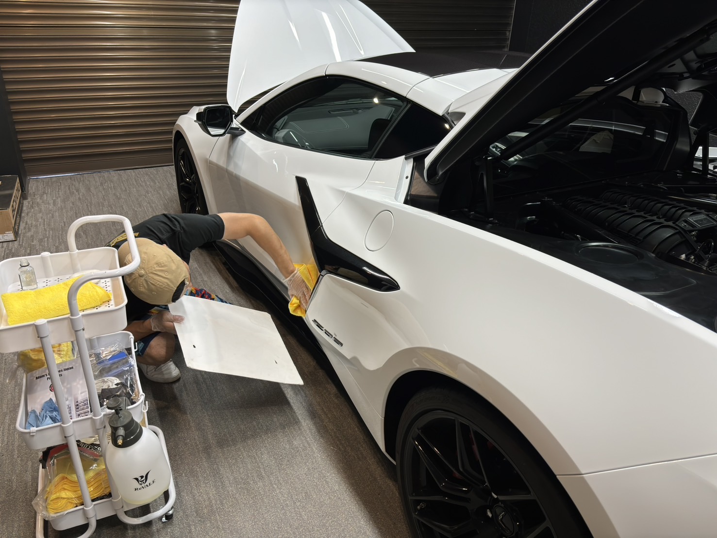 施工準備施工前にお車の洗浄を行い、表面を清潔に保ちます。また、施工に必要な素材や道具を準備し、万全の体制を整えます。 |